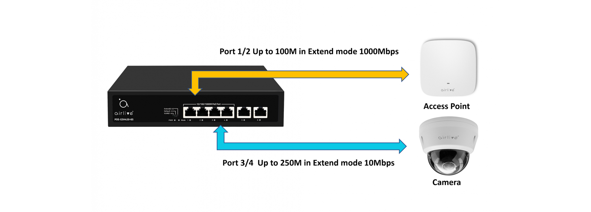 | Extend | Extension mode, PoE power supply and data transmission distance can be extended to 250 meter at the transmission rate 10Mbps Port 3~4 only. Note: VLAN and Extend mode cannot be used at the same time. |