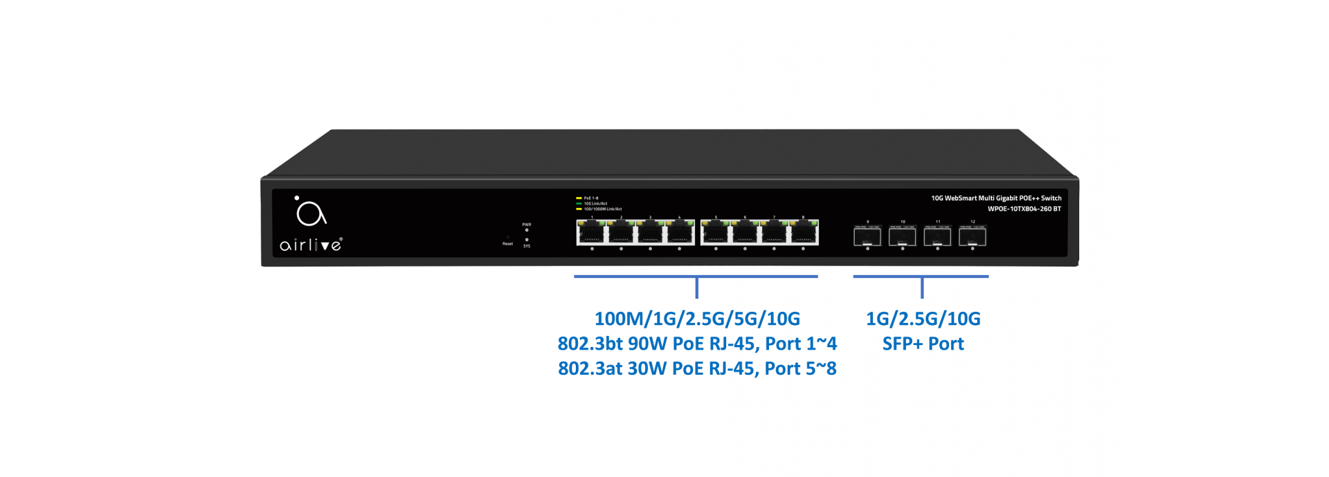 | Model | WPOE-10TX804-260 BT 12-port 10Gbps Web Smart Multi Gigabit POE ++ Switch, incl. 8x 10G RJ45 PoE+?++ and 4x SFP+ 10G, Plug and Play, Auto-negotiation |
